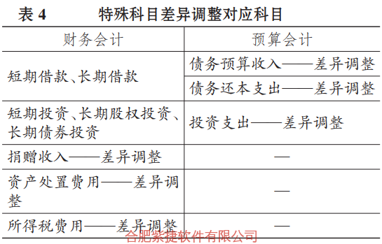 从表2、表3不难看出,收入和费用(支出)的差异调整都能找到彼此的对应科目,主要变化的是财务会计的“收入”改为了预算会计的“预算收入”(“投资收益”与“投资预算收益”例外),财务会计的“费用”改为了预算会计的“支出”。值得注意的是,对于“财政拨款收入”和“财政拨款预算收入”而言,实际上财务会计和预算会计对于此项收入的确认是同步的,不会产生差异,因此也可以不用设置此项收入的调整项。表4列举了五个在差异调整科目对应上比较特殊的科目。