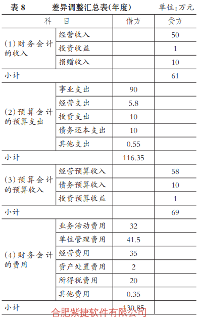 例5中的差异只存在于所得税费用中,在差异调节表中体现为减去所得税费用的差异。通过设置“差异调整”辅助明细科目,在年末编制差异调节表时,可以直接按照收支类科目的明细账,把各科目的差异调节部分差额直接填写到对应的差异调节表中,这样既方便也不容易出错,可以减轻基层会计人员的工作负担。下面以事业单位为例,进行详细的报表编制和差异调节。